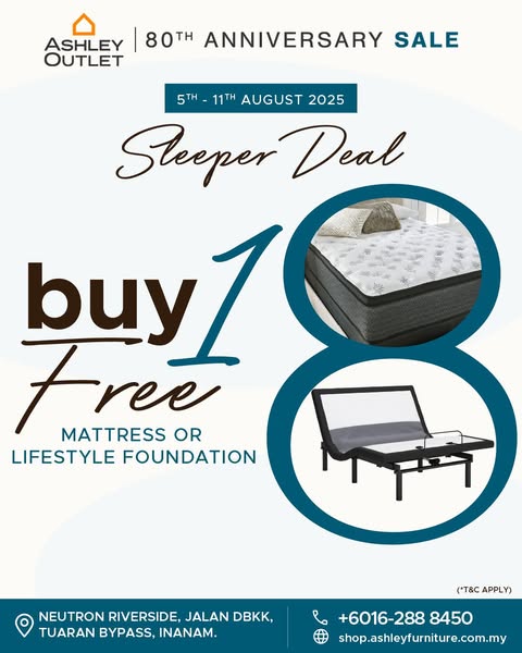 搜索关键词 Ashley Furniture, Home Decor, Mattress Sale, Furniture Sale, East Malaysia, Kota Kinabalu, Kuching, Borneo Style, Anniversary Sale, Limited Time Offer优势 Up to 80% off on home decor,Buy 1 Free 1 mattress deals,Up to 58% off on furniture,0% interest installment plans