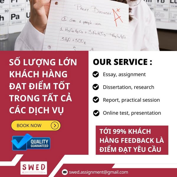 🔥 Team SWED cung cấp dịch vụ đa dạng, bao gồm #essay, #assignment, #dissertation, #research, #presentation, #report, #test,… Và trong tất cả các loại hình dịch vụ, team mình trong suốt hơn 4 năm làm việc luôn nhận được gần 99% phản hồi điểm tốt của khách hàng, rằng khách đạt được số điểm mà họ mong muốn.
