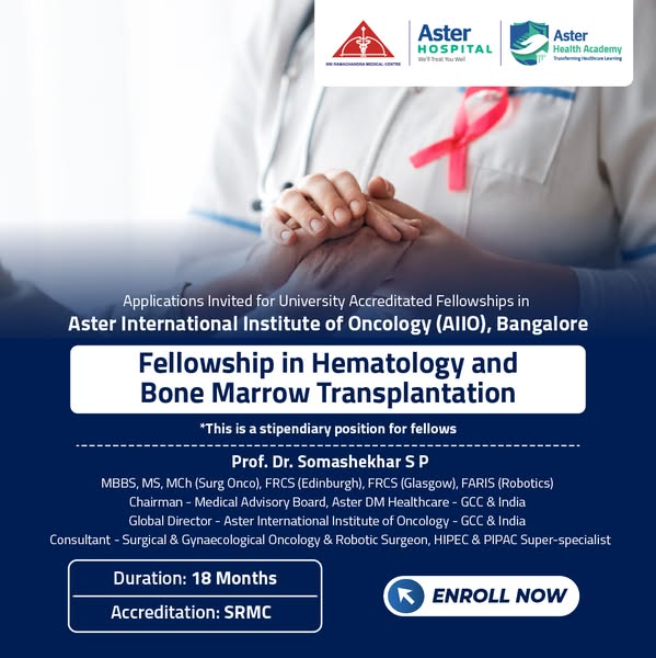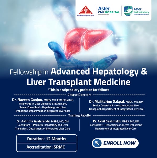 Offered by Aster Health Academy in collaboration with Aster CMI Hospital and SRMC, this fellowship equips postgraduates with hands-on clinical experience in liver disease management, diagnostics, and therapeutic interventions under expert faculty guidance.