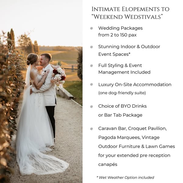 搜索关键词 Hunter Valley wedding venue, country wedding packages, luxury wedding accommodation, wedding event planning, stunning wedding locations, complete wedding services优势 Stunning indoor and outdoor event spaces with wet weather options,Full styling, planning, event management and on-the-day coordination,Extensive in-house styling inventory including florals,Luxury on-site accommodation for up to 30 guests,BYO drinks or bar tab package options,Off-peak pricing and mid-week discounts available
