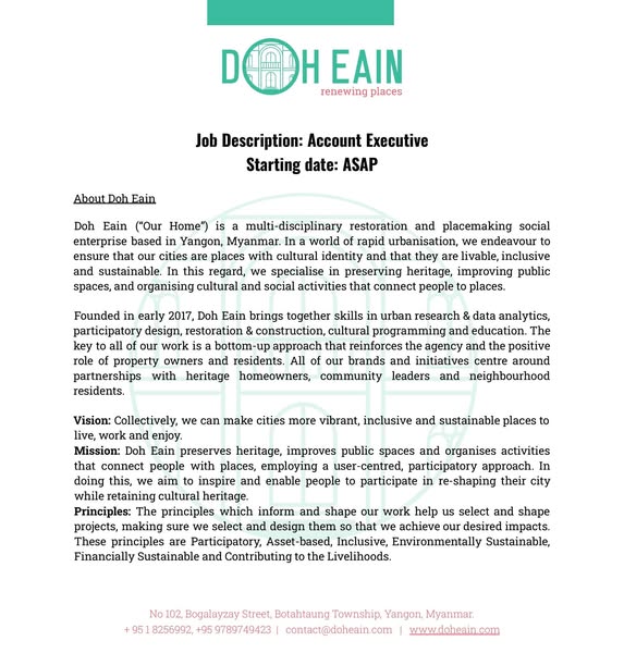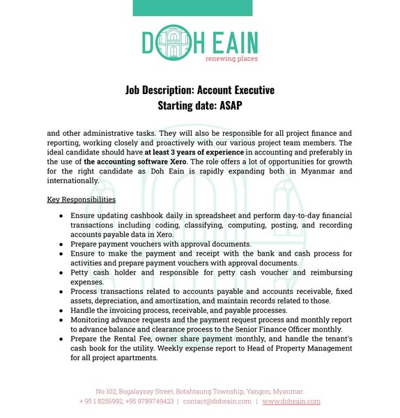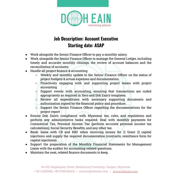ဒို့အိမ်က Account Executive ရာထူးအတွက် အချိန်ပြည့်လုပ်ဆောင်ရန် အတွေ့အကြုံရှိသူတစ်ဦးကို ရှာဖွေလျက်ရှိပါတယ်။ သင်က လုပ်ငန်းဆိုင်ရာ ငွေကြေးခန့်ခွဲမှုအပိုင်းမှာ အတွေ့အကြုံရှိသူတစ်ဦးဖြစ်ဖို့ လိုအပ်ပါတယ်။ Account Executive တစ်ဦးအနေနဲ့ ဒို့အိမ်က ဦးစီးဆောင်ရွက်နေတဲ့ စီမံကိန်းများအတွက် မှန်ကန်တိကျတဲ့ ဘဏ္ဍာရေးဆိုင်ရာ အစီရင်ခံစာတွေကို ထုတ်ဝေရာမှာ အရေးပါတဲ့ ကဏ္ဍကနေ ပါဝင်လုပ်ကိုင်ရမှာဖြစ်ပါတယ်။