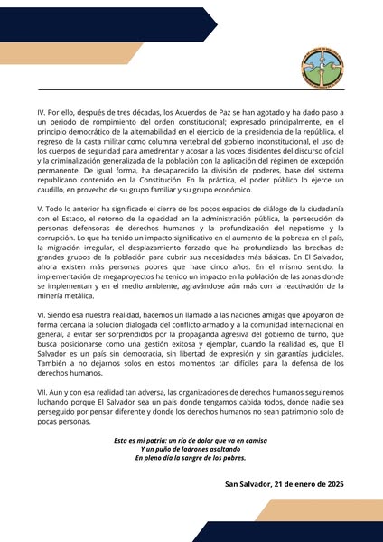En este espacio denunciamos el retroceso en la implementación de los #AcuerdosDePaz y que cada vez se vuelve más preocupante las formas en las que hay violaciones a los #DerechosHumanos de la población salvadoreña, mediante acciones como el uso de los cuerpos de seguridad para amedrentar y acosar a las voces disidentes del discurso oficial, la criminalización generalizada de la población con la aplicación del régimen de excepción permanente, la ausencia de la división de poderes y, recientemente, la aprobación de una ley minera, a pesar de sus graves implicaciones para la población y el medio ambiente.