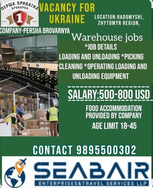 📍 Location: Radomyshi, Zhytomyr Region 🏢 Company: Persha Brovarnya (Leading Brewery) 🛠️ Job Roles: • Loading & Unloading • Picking & Cleaning • Operating warehouse equipment 💰 Salary: $500 – $800 USD 🍽️ Food & Accommodation: Provided by Company 👥 Age Limit: 18 – 45 Years ✅ Safe & Verified Opportunity ✅ Fast Processing by Seabair Enterprises 📞 Contact Now: 9895500302 🛫 Limited Seats – Apply Today!