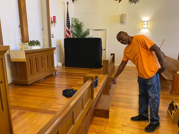 Bill Marini and other Roser Church volunteers and staff have been working tirelessly to restore the Roser facilities. They want to thank Mark Gill and Axelle Builders (axellebuilders.com) for taking on the Roser Memorial Chapel restoration project. Roser is so grateful to the carpenter, Johan Harding, who put his heart and soul along with experience and skill into the project to restore the original look with better materials and flood resistant measures. The building has been rewired, with the electrical system now behind the thicker individual boards of the wainscotting rather than under the floor. Once the floorboards dried out, they were laid back in place and refinished, but now there is thick foam under the floor that will prevent water from coming up through the floor again. The step going up to the stage has been repaired and the big doors have been sanded and refinished and will have new hardware installed.