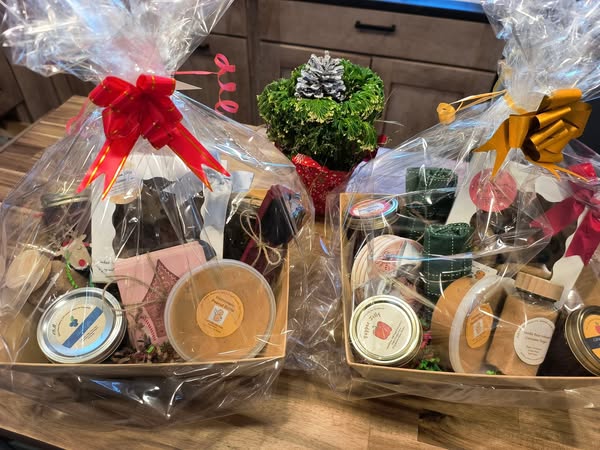 Some pretty Holiday Baskets heading out today. Today's include, Cookies, Scones, Peanut 🥜 butter, Vanilla infused cinnamon sugar sprinkles, Chocolate Sour Cherry preserves 🍒, Candied Jalapenos 🌶️, Pepper jelly 🫑, Caramel Apple Jam 🍏 and more!