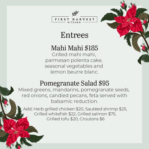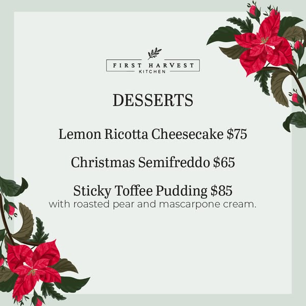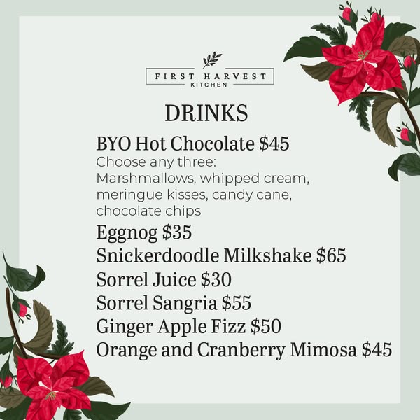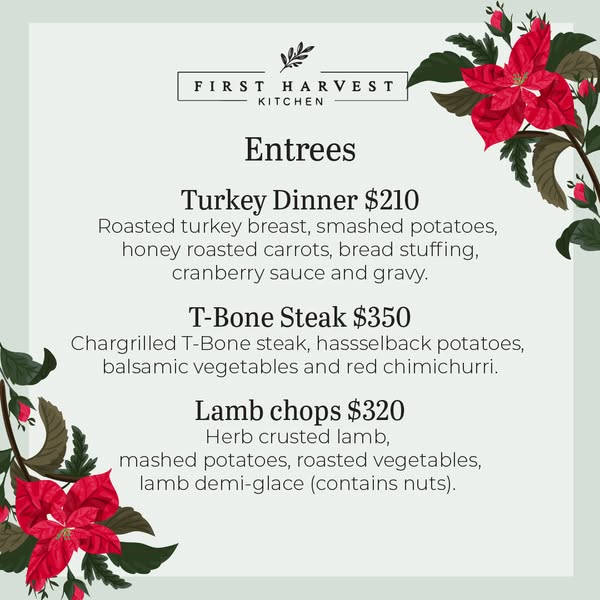 Celebrate the Christmas season with us at First Harvest Kitchen and dine in with us!