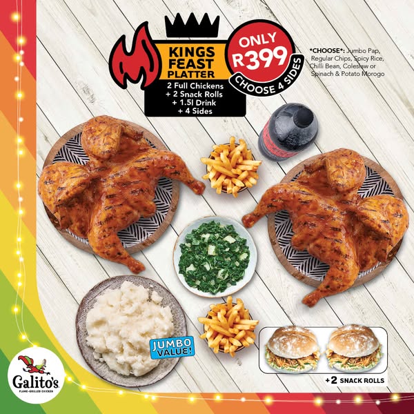 2 Full Chickens + Snack Rols + 4 Sides* of your choice + 1.5l Drink - Feeds 8 for R399