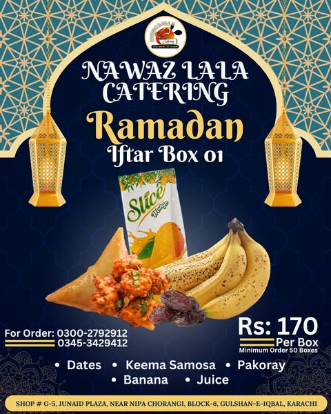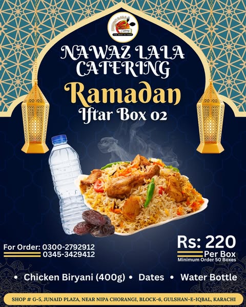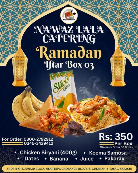 #RamadanKareem #IftarDeals #IftarBox #RamadanSpecial #CateringServices #HalalFood #DeliciousIftar #FoodLovers #KarachiEats #PakistaniFood #NawazLalaCatering