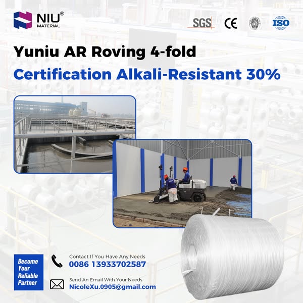 Yuniu Alkali-resistant Roving The quality is passed CE, ISO9001, REACH, SGS standards The performance of strong alkaline environment resistance is 30% Longer than that of standard yarn It is specially designed for scenes such as concrete reinforcement and chemical filtration. Free samples are now available WeChat/Whatsapp: 0086 13933702587 Email: NicoleXu.0905@gmail.com Website: