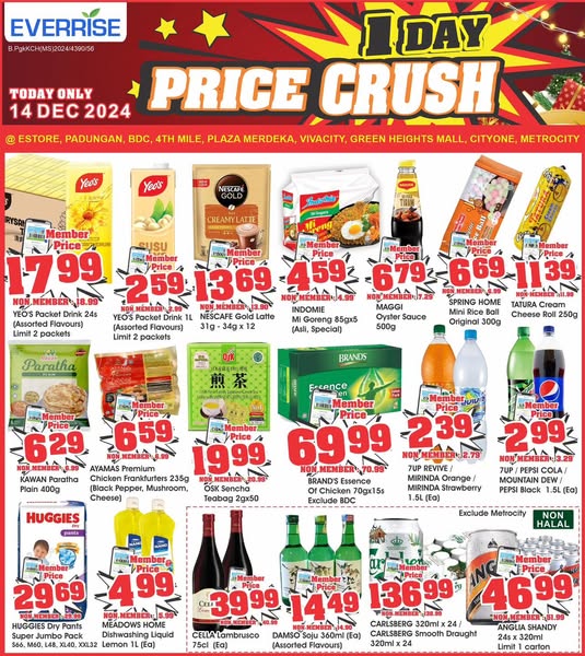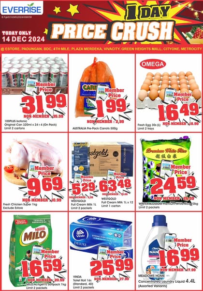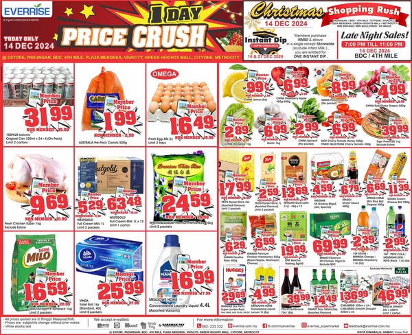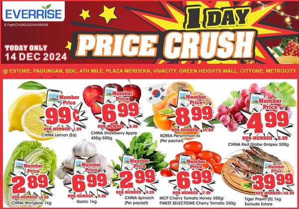 搜索关键词 Everrise promotion, Supermarket deals, Malaysia grocery, Price crush, Member exclusive, One day sale, Kuching outlets, Whatsapp promotion, Telegram channel, Online shopping优势 Limited-time price discounts,Exclusive member deals,Easy access via WhatsApp, Telegram, and website