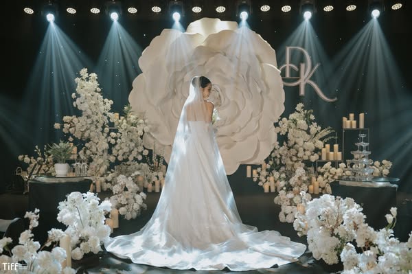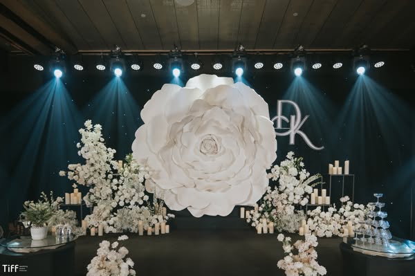 Sắc trắng nhưng không hề đơn điệu bởi sự hiện diện của bông hoa khổng lồ đầy ấn tượng ở sân khấu chính, nơi đây một lần nữa trở thành tâm điểm thu hút mọi ánh nhìn. Bông hoa này không chỉ là một yếu tố trang trí đơn thuần mà còn là sợi dây liên kết hài hòa được chúng mình sử dụng để tạo nên trải nghiệm liền mạch giữa hai phần của lễ cưới.