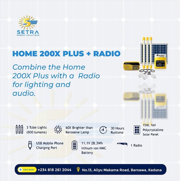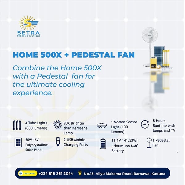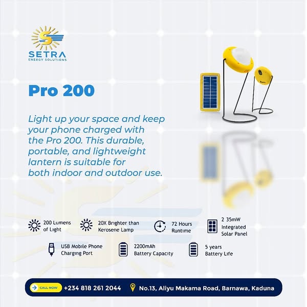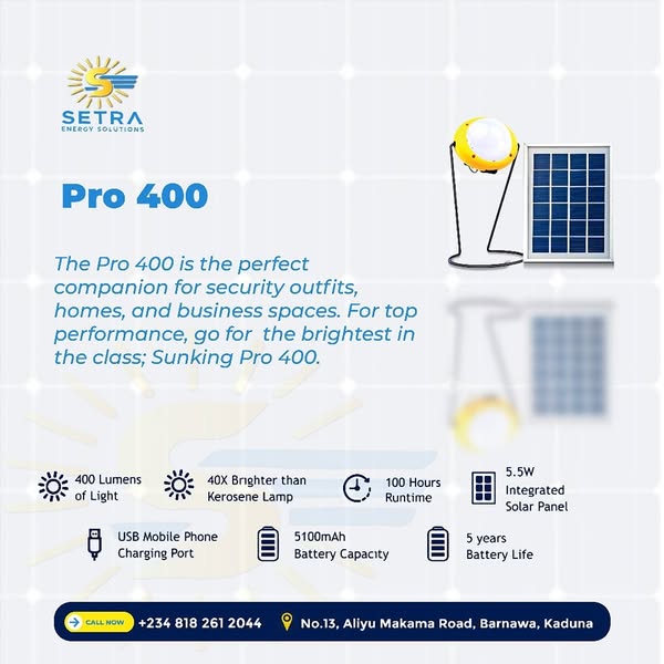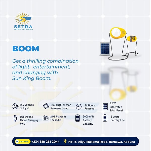 搜索关键词 SunKing solar energy, solar fans lanterns, Kaduna Nigeria, renewable energy, affordable solar solutions, solar power systems, free installation, setra energy solutions, off-grid lighting, green energy Kaduna优势 Reliable and Long-lasting,Affordable,Free Installation,Clean and Green Energy,Off-grid solution