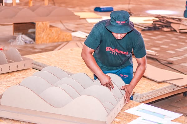 A custom-built stage, boldly adorned with striking Xanita , a 100% recycled material creating a modern, elegant centerpiece that commanded attention.