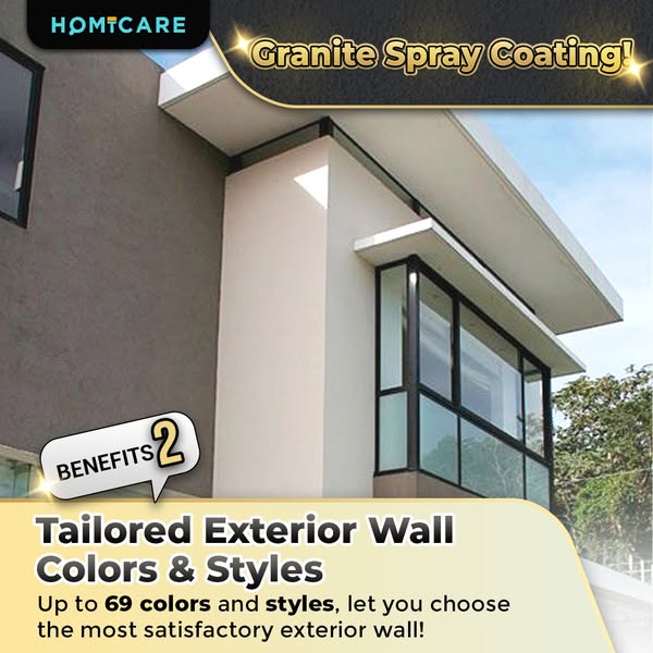 搜索关键词 granite spray coating, house exterior paint, durable wall coating, weather resistant paint, washable exterior paint, Homicare painting, exterior wall renovation, long lasting paint, customized wall colors, anti peeling paint优势 Long lifespan (15 years),Weather and leak resistance,Super-washable and antifouling,Authentic granite texture,Customizable colors and styles (69 options),UV resistance,Easy application with air hopper spray gun,Eco-friendly and water-based