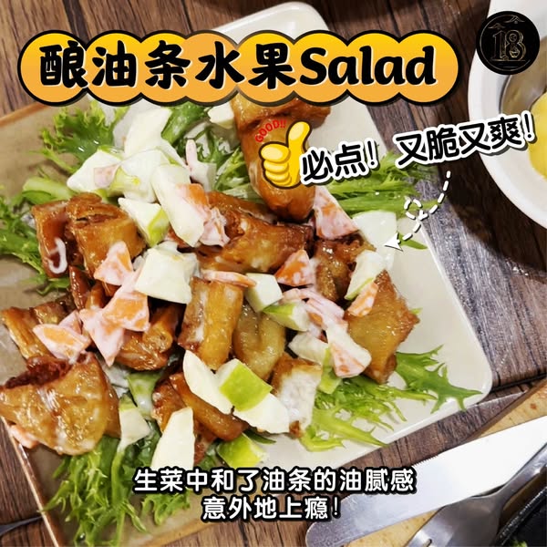 一口咬下去,油条超酥脆!带点微微的咸香,遇上清甜多汁的水果,每一口都是很refreshing的口感!💦 沙拉酱微酸微甜,让整道沙拉更有层次,完全不会腻,吃了直接上瘾!😋