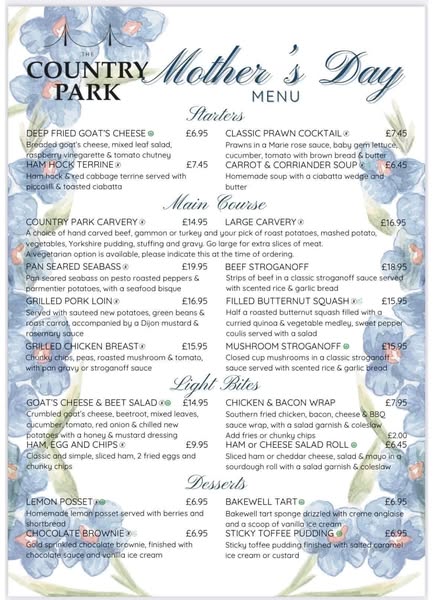 搜索关键词 Mother's Day Restaurant, Family Dining, Sunday Lunch, Restaurant with Views, Home Cooked Meal, Special Occasion Meal, County Park Restaurant, March 30th Dining, Restaurant Booking, The Country Park Restaurant优势 Delicious, fresh, home-cooked meal,Beautiful views,Convenient booking times
