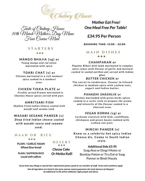 搜索关键词 Mother's Day dining, Chutney House Windsor, free Mother's meal, Windsor restaurant, special offer restaurant, family meal offer, Mother's Day promotion, Restaurant booking Windsor, Indian food Windsor, family celebrations Windsor优势 Free meal for mothers,Special Mother's Day celebration,Convenient Windsor location