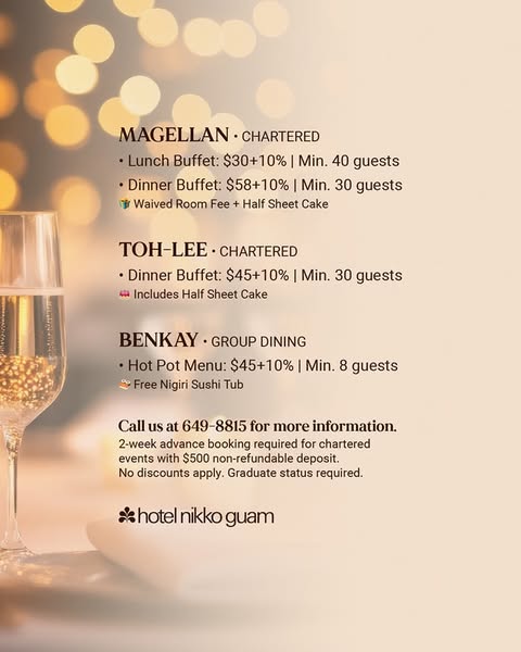 搜索关键词 Guam graduation, graduation dining, hotel Nikko, graduation buffet, graduation party, Nikko Guam, Guam hotel, graduation celebration, group dining, hot pot menu优势 Variety of dining options (buffet, hot pot),Special graduation dining packages,Attractive add-ons (waived room fee, cake, sushi)