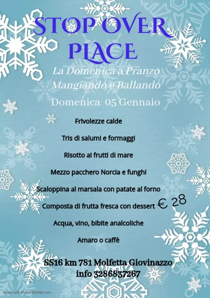 Primo weekend del 2025 in arrivo , passa a trovarci allo STOP OVER PLACE di Giovinazzo, sabato si balla e domenica a pranzo e a cena balera , passa il weekend in nostra compagnia, con tanto divertimento allo STOP OVER PLACE ,sabato cena e dance e domenica a pranzo e a cena noi siamo pronti ad accogliervi , passate un fine settimana con tanto divertimento ed allegria . Sabato 04 Gennaio a cena serata , domenica 05 Gennaio a pranzo con ballo e cena in balera, passali con noi , nella nostra grande famiglia, all'insegna del divertimento,animazione ,live music,djset