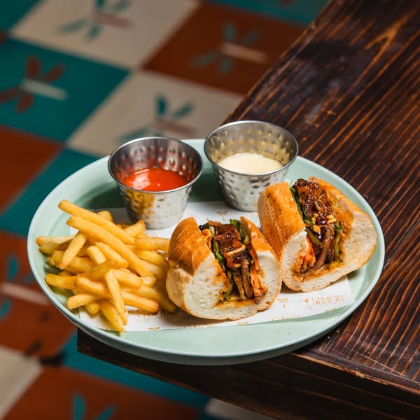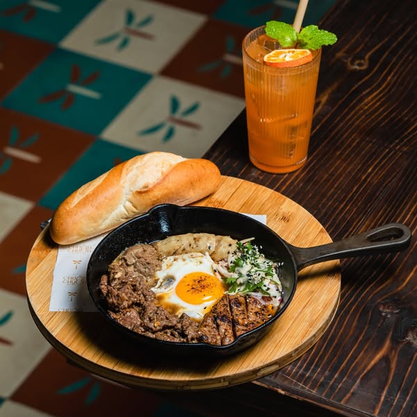 Choose between Chuồn Chuồn Bánh Mì Chảo or Chuồn Chuồn Cơm Tấm, served with a drink of your choice from the breakfast menu.