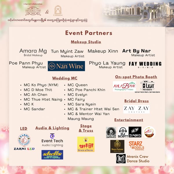搜索关键词 Mandalay Wedding Fair, Wedding Services Myanmar, Wedding Discounts Mandalay, Myanmar Wedding Event, Wedding Photoshoot Mandalay, Myanmar Wedding Dress, Myanmar Wedding Lucky Draw, Wedding Service Supplier, Wedding Fair 2025, Myanmar Ceremon优势 Wide range of wedding services,Top wedding service suppliers,Attractive discounts,Lucky draw prizes,Meet celebrities,Coupon redeemable for food and drinks