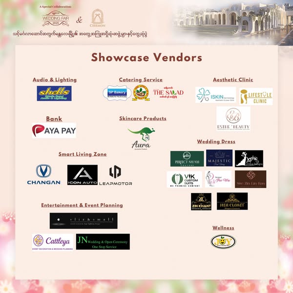 搜索关键词 Mandalay Wedding Fair, Wedding Services Mandalay, Wedding Discounts Myanmar, Mandalay Event 2025, Myanmar Wedding Planning, Wedding Dress Mandalay, Wedding Photoshoot Mandalay, Ceremon Wedding, Mandalay Wedding Supplier, August Wedding Fair优势 Wide variety of wedding services,Top wedding service suppliers,Attractive discounts,Lucky draw prizes,Meet popular artists,Food & beverage options with entry coupon
