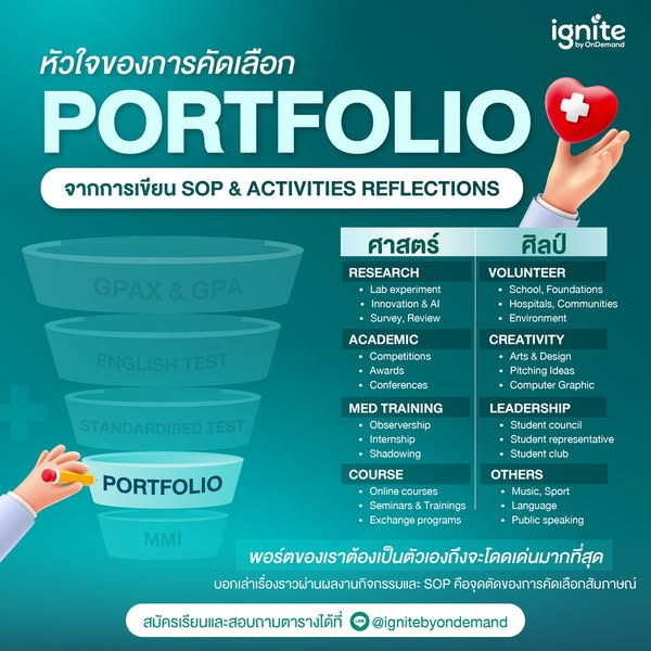 搜索关键词 medical school portfolio, portfolio preparation course, TCAS preparation, medical program application, ignite by ondemand, medical interview preparation, medical school admission, medical portfolio review, medical student consultation, TCAS69 update优势 Expert guidance from Medical Program Director,Portfolio review by experts,Consultation with medical students,Mock Interview before MMI,Updated TCAS69 content