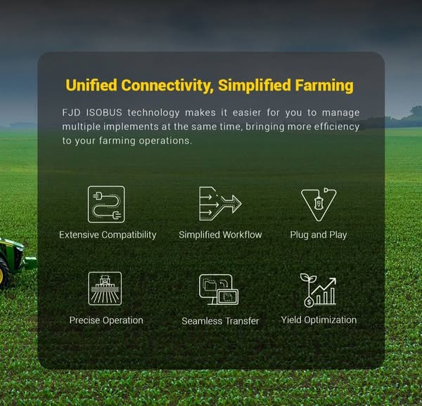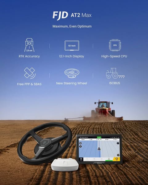搜索关键词 FJD AT2, agricultural navigation, RTK precision, auto steering, farming technology, precision agriculture, tractor GPS, agriculture vehicle, navigation system, FJD AT2 Max优势 RTK precision below 2.5 cm,Powerful steering wheel motor,Easy-to-use touchscreen,Multiple driving modes,Compatible with all agricultural vehicles,Navigation setup and support provided,Improved Version