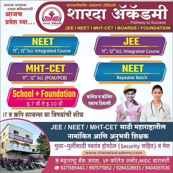 搜索关键词 JEE NEET preparation, MHT CET coaching, science entrance exam, Sharada Academy Baramati, 11th 12th science classes, medical engineering entrance, study material test series, doubt clearance session, experienced teachers Maharashtra, free registration entrance exam优势 Experienced teachers,Well-designed study material,Weekly test series,Doubt clearance sessions