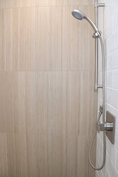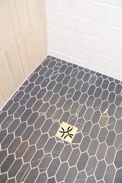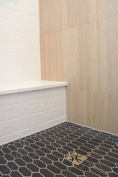 This luxurious bathroom feels like a retreat at the salon! The mosaic black, picket shaped porcelain tile pops against the light, natural wood tone textured tile shower walls. Matte black and champagne bronze mixed metal finishes complement the luxury tile. Gorgeous! Contact Agape today for your bathroom remodel.