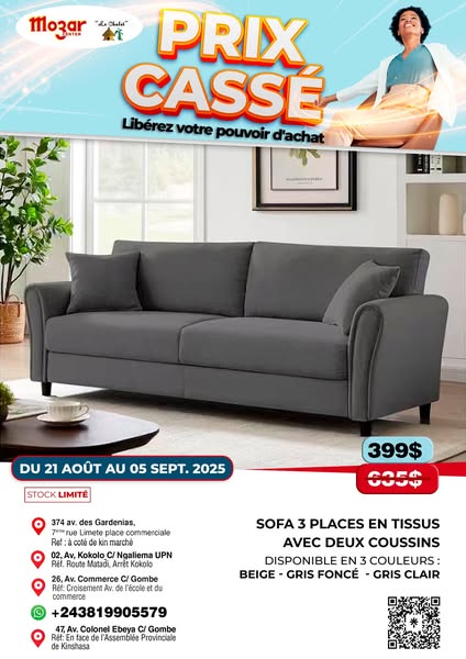 搜索关键词 furniture appliances sale, Kinshasa home goods, Mozar Center promotion, discount home improvement, Congo furniture deals, affordable sofas, refrigerators, water dispensers, home furnishing, limited stock优势 Discounted Prices,Wide Range of Products,Multiple Store Locations