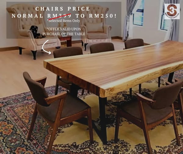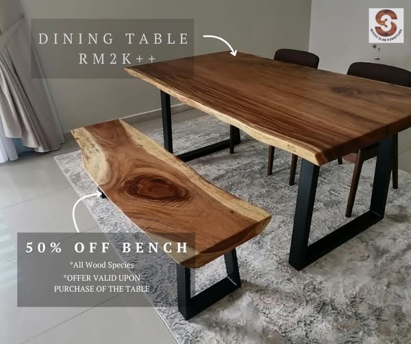搜索关键词 furniture sale, dining table, chair discount, clearance sales, Klang valley delivery, wood species, metal leg table, dining set promotion, Malaysia furniture, cheap furniture优势 Up to 60% Discount,Free Delivery in Klang Valley (Above RM 2,000),Free Powder Coated Metal Leg For Dining Table,50% OFF FOR BENCH,RM250 FOR DINING CHAIR (with table purchase)