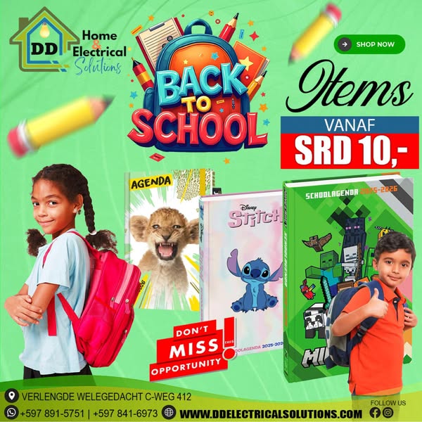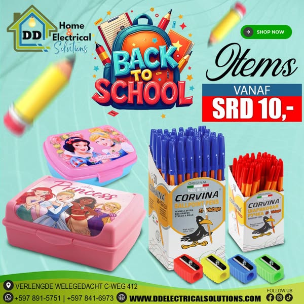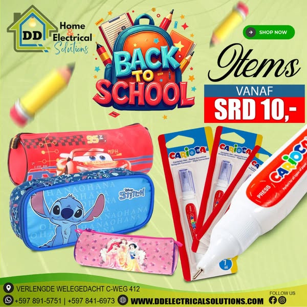 搜索关键词 Back to School, School Supplies, Suriname Deals, Paramaribo School, Affordable School Supplies, Student Discount, Education Supplies, Cheap School Items, School Promotion, Back to School Deals优势 Wide variety of school supplies,Affordable prices (from SRD 10),Multiple payment options (bank transfer, POS),Delivery available in specific areas