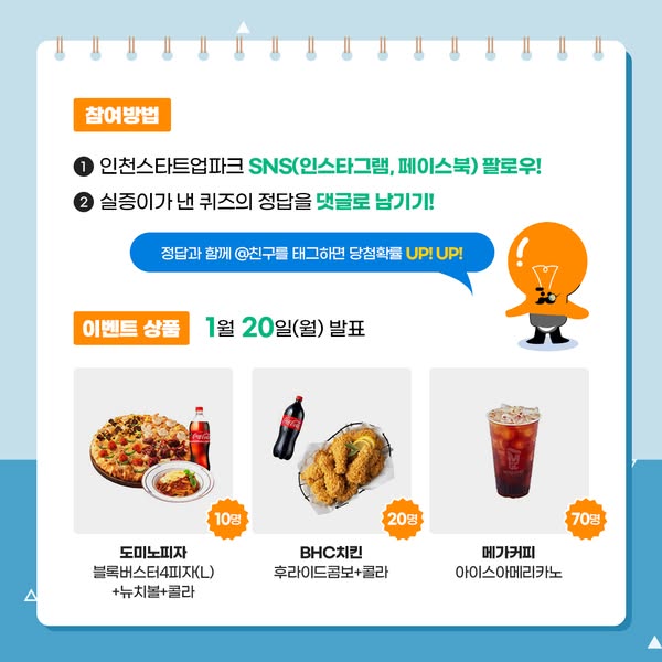 搜索关键词 incheon startup park, emoji quiz, follow event, prize giveaway, pizza chicken coffee, social media contest, tryout program, startup incubation, Korean startup, Startup promotion优势 Opportunity to win prizes (pizza, chicken, coffee),Easy participation (follow, comment, tag),Promotes awareness of Incheon Startup Park