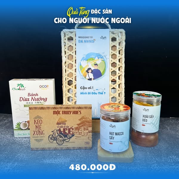 Người Thương đang tìm một món quà tinh tế, dễ ăn, mang đậm hương vị Việt Nam và Đà Nẵng? Vigift gợi ý những set quà có sự kết hợp giữa trái cây, bánh, trà – vừa đẹp mắt, vừa ý nghĩa cho bạn bè ngoại quốc.