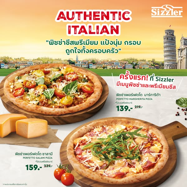 搜索关键词 Authentic Italian Cuisine, Sizzler Thailand, Pizza Pasta Deal, Italian Food Delivery, Limited Time Offer, Premium Ingredients, Restaurant Promotion, Food Discount, Sizzler Perfetto, Italian Flavors优势 Authentic Italian ingredients,Discounted prices on selected items,Delivery service available