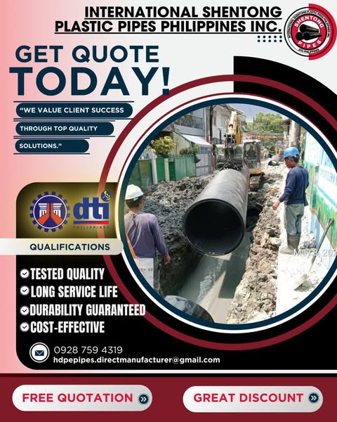 搜索关键词 HDPE pipes Philippines, plastic pipes supplier, DPWH project pipes, drainage solutions, sewer pipes, cost effective pipes, durable pipes, long lasting pipes, construction materials, industrial pipes优势 Reliable,Certified Durable,Tested Quality,Long Service Life,Low Maintenance,Less Manpower,Cost Savings,Volume Discounts,Free Quote