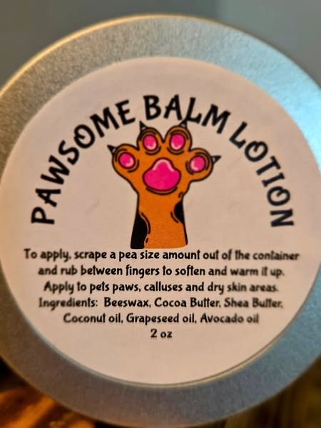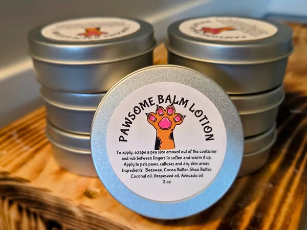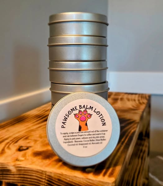 Pawsome Balm is a gentle, pet-safe lotion crafted to soothe irritated skin on dogs and cats. Whether it's cracked paws, dry noses, or rough elbows, this nourishing balm provides fast-acting moisture and protection. Formulated with natural, pet-friendly ingredients like Cocoa butter, shea butter, beeswax and coconut oil, it’s perfect for everyday use on sensitive areas.
