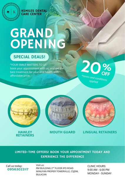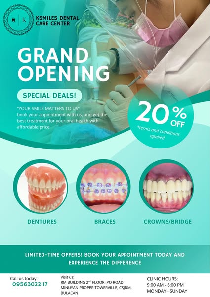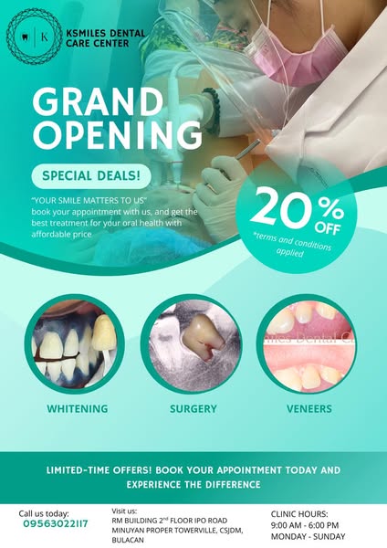 搜索关键词 dental clinic, dental services, oral health, affordable dental, Bulacan dentist, dental veneers, braces treatment, oral surgery, root canal, dental care优势 Grand opening discount (up to 20%),Affordable price,Convenient location,Wide range of dental services