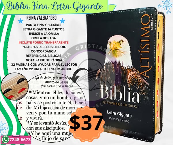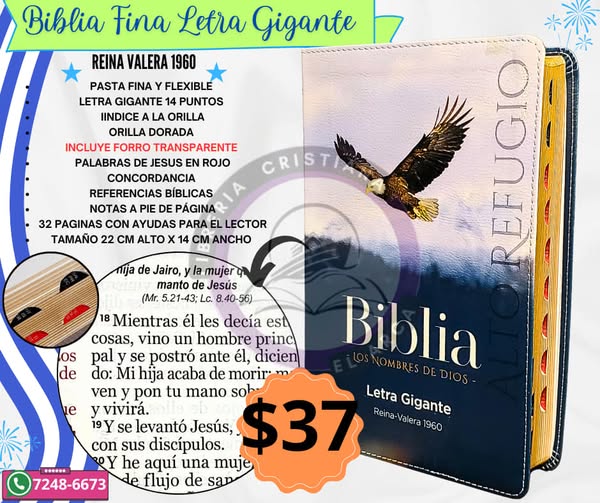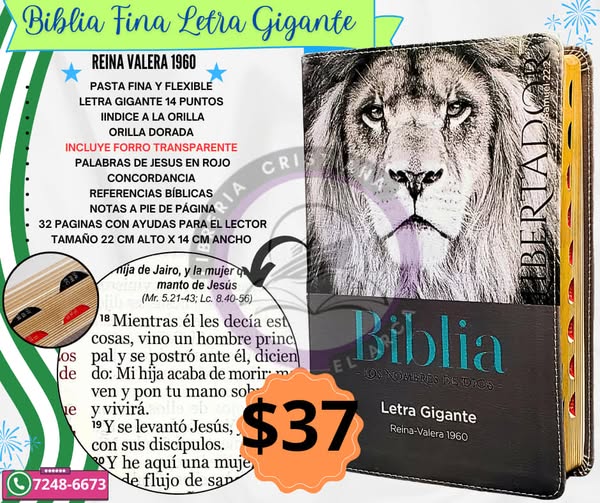 Imagina tener en tus manos una Biblia que no solo alimenta tu espíritu, sino que también refleja la majestuosidad y la fuerza de la fe. Una edición especial, con diseños imponentes del León de Judá, el Águila y el Arca, que evocan poder, protección y la promesa de Dios. Su letra gigante te permite leer cómodamente, y cada detalle ha sido pensado para que tu experiencia sea única.