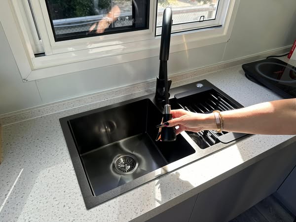 ✔️ Modern Kitchen Design – Silica-free stone effect benchtop, flip mixers, and space for a dishwasher/washing machine