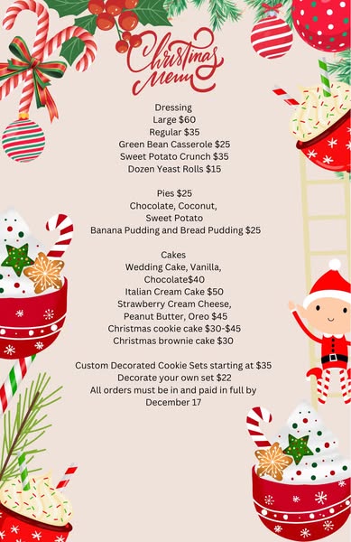 Christmas menus, these are basic menus for parties and for Christmas meals, we will be open December 23 For Pick ups if you have any questions or want to order anything not on the menu give us a call! Don't forget we also cater! 3187098906
