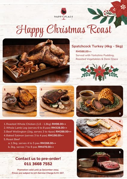 搜索关键词 Christmas specials, festive meals, turkey roast, pre-order food, holiday dining, happy place restaurant, malaysia christmas food, christmas bucket, christmas roasts, family christmas meal优势 Convenient Christmas meals,Festive curated selection,Pre-order availability