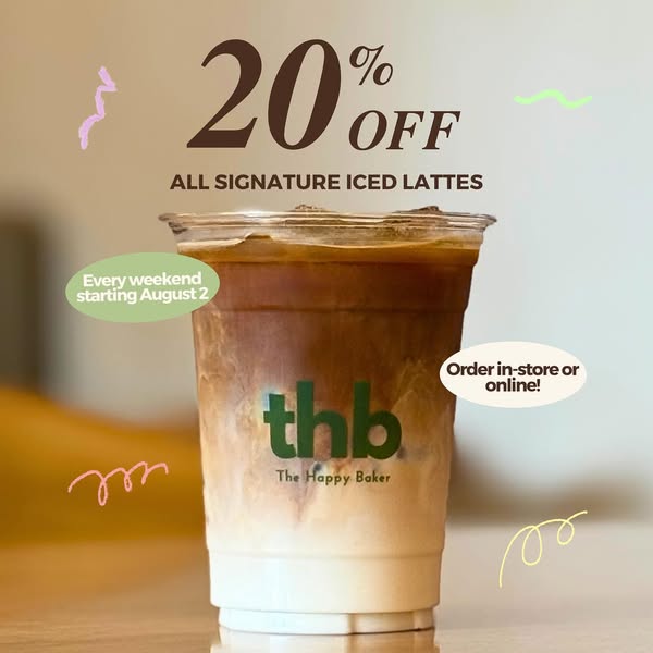 搜索关键词 iced latte, weekend discount, coffee delivery, GrabFood, Foodpanda, Saturday Sunday offer, beverage promotion, caffeinated drinks, signature lattes, Philippine coffee优势 20% discount on weekends,Available in-store and for delivery,Convenient delivery options (GrabFood, Foodpanda)