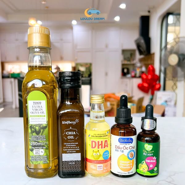 6 – Dầu ăn dặm cung cấp chất béo giúp bé phát triển thị lực và trí não, dầu chiên xào khác dầu trộn. Bảng dầu cao cấp gọi tên La Tourangelle, Wolfberry, Tesco, dầu nội địa cũng rất thơm có Mammy, Thuyền Xưa, Biobaby,… Dầu óc chó, macca, hạt chia hương nhẹ, dầu olive, gấc, mè hương đậm vị hơn. Lượng dầu ăn phù hợp khoảng 5-10ml/ngày, ko quá 4 ngày/tuần và ko quá 2 bữa/ngày.