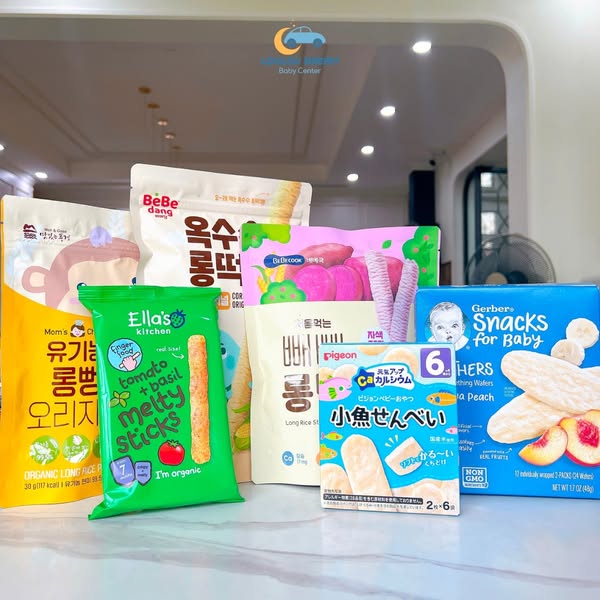 13 – Bánh ăn dặm chọn loại thanh dài, thanh dẹt trước để cầm nắm cho dễ. Bánh Hàn không chiên dầu, không gia vị, có Bebecook, Bebedang, Mom Choice lúc nào cũng đắt hàng. Gerber dẹt, Kiddylicious, Ella Kitchen có bản organic cao cấp hơn. Lớn hơn tầm 8-10m+ ăn texture nhỏ hơn luyện kĩ năng bốc nhón như Gerber sao, bỏng Bebecook,… Trên 12m+ mời các loại bánh có nhân kem như bánh cuộn, bánh xốp hoặc bánh quy.