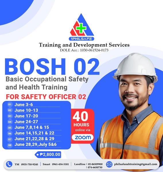 搜索关键词 COSH BOSH Training, Safety Officer Training, Occupational Safety, Health Training, DOLE Accredited Training, Workplace Safety, Safety Certification, Risk Management Training, Construction Safety Training, Engineering Safety Training优势 Certificate of Completion,Training Manual,Safety Officer ID,OSH Standards E-book,Free delivery Nationwide,Trained with multi-skilled OSH Consultants