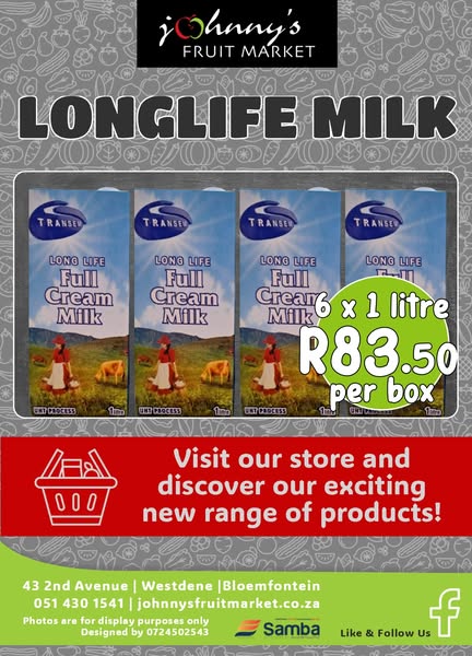 - Full Cream Longlife Milk > 6 x 1 litre only R83.50 per box!