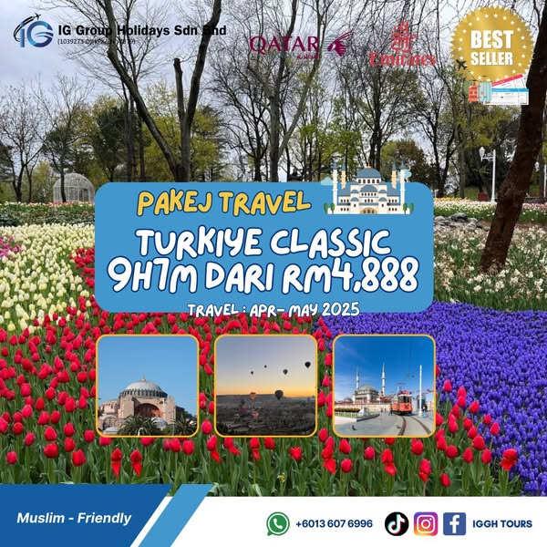 搜索关键词 travel package, holiday promotion, Dubai tour, Korea trip, Turkey tulips, Vietnam vacation, April May travel, family holiday, group travel, Jom Travel优势 Variety of destinations (Dubai, Turkey, Seoul, Hanoi),Packages for individuals, couples, families,Flexible travel dates (April-May 2025),Deposit to secure slot