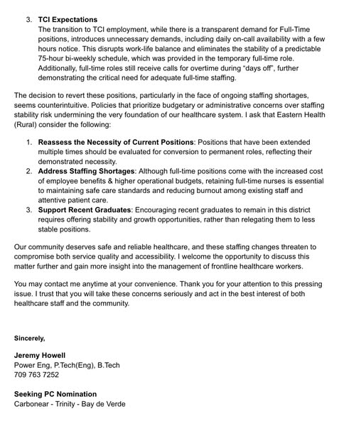 Carbonear General Hospital LPN Staffing Changes 😐 Last month, I was informed by several individuals about multiple Temporary Full-Time LPN positions being replaced with Temporary Call-In positions. Below is a letter I sent to our district’s MHA, the Minister of Health & Community Services, and the VP for Eastern Health’s Rural Zone.